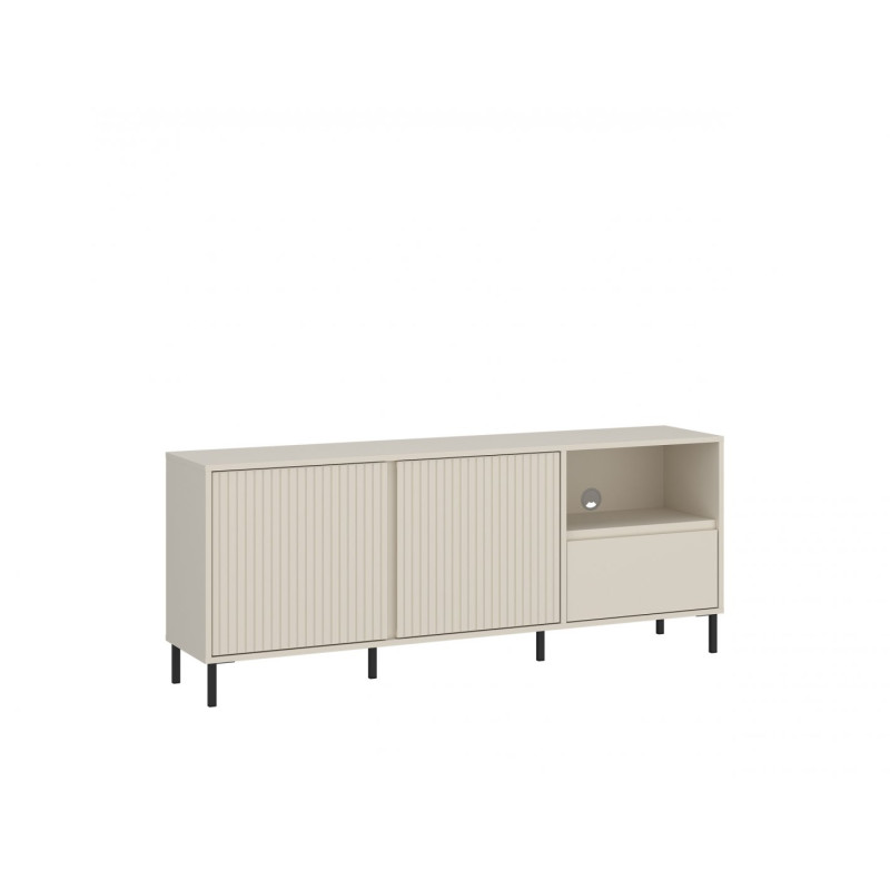 Komoda RTV AVENALE AVEF01 w subtelnym dekorze kaszmir to idealne rozwiązanie do nowoczesnych salonów, w których estetyka idzie w parze z funkcjonalnością. Jej jasna, ciepła kolorystyka wprowadza do wnętrza harmonię i spokój, a pionowe ryflowania frontów oraz czarne, metalowe nóżki podkreślają nowoczesny charakter mebla.