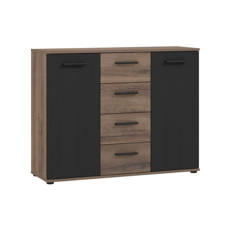Komoda loftowa 105 cm to stylowy mebel, który wnosi nowoczesny charakter do każdego wnętrza — od salonu, przez sypialnię, aż po przedpokój czy pokój młodzieżowy. Jej design łączy surowe akcenty loftowe z funkcjonalnością codziennego użytku — połączenie dekorów dąb czarny i dąb szlachetny podkreśla naturalny wygląd drewna, a czarne uchwyty z wysokiej jakości tworzywa dodają elegancji i nowoczesności. Komoda została zaprojektowana tak, by idealnie wpisywać się w aranżacje w stylu industrialnym i współczesnym, tworząc zarówno praktyczne, jak i estetyczne rozwiązanie dla Twojego domu.