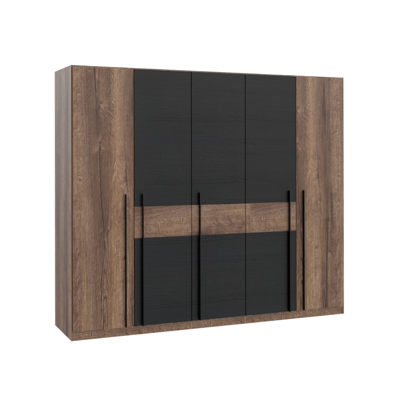 Pojemna i stylowa szafa 260 cm z kolekcji Bellevue to idealne rozwiązanie do sypialni lub garderoby, łączące nowoczesny design z funkcjonalnością. Jej szeroka konstrukcja o wymiarach 260,8 × 220 × 62,3 cm zapewnia dużo miejsca na całą garderobę — zarówno odzież wiszącą, jak i poukładane akcesoria. Stylowy duet dekorów dąb szlachetny i dąb czarny podkreśla elegancki charakter mebla, a minimalistyczne uchwyty dodają mu nowoczesnej lekkości. Oświetlenie LED w standardzie nie tylko ułatwia korzystanie z szafy po zmroku, ale też wprowadza subtelną atmosferę we wnętrzu.
