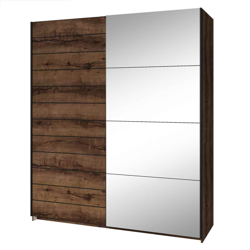 Połączenie dekoru dąb monastery z klasyczną czernią tworzy elegancką i wyrazistą kompozycję kolorystyczną. Dodatkowym atutem jest lustrzana powierzchnia frontu, która nie tylko ułatwia codzienne korzystanie z szafy, ale również optycznie powiększa przestrzeń i rozjaśnia wnętrze. Dzięki zastosowaniu drzwi przesuwnych mebel sprawdzi się szczególnie dobrze w mniejszych sypialniach, gdzie liczy się wygodne zagospodarowanie przestrzeni.