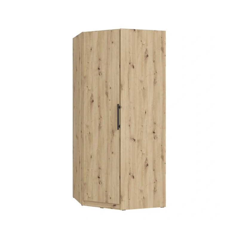 Narożna szafa z półkami CADIXO Dąb Artisan to przemyślany i estetyczny sposób na wykorzystanie przestrzeni narożnej w sypialni, garderobie lub pokoju młodzieżowym. Jej pojemne wnętrze obejmuje drążek na odzież oraz pięć półek, z czego dwie mają regulowaną wysokość, co pozwala na dopasowanie wnętrza do własnych potrzeb. Wyrazisty dekor Dąb Artisan wiernie odwzorowuje strukturę naturalnego drewna, nadając wnętrzu ciepło i charakter. Nowoczesna forma, linearny uchwyt w kolorze aluminium oraz możliwość zestawienia z innymi meblami z kolekcji CADIXO czynią tę szafę funkcjonalnym i stylowym wyborem do każdego wnętrza.