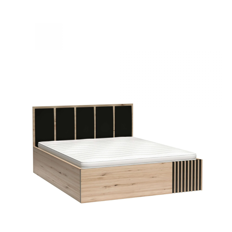 Solidna konstrukcja łóżka oraz staranne detale sprawiają, że to nie tylko miejsce do wypoczynku, ale również designerski element aranżacji wnętrza. Matowa, czarna rama łóżka harmonijnie współgra z ciepłym drewnem i lamelami MDF, nadając mu nowoczesny i elegancki wygląd.