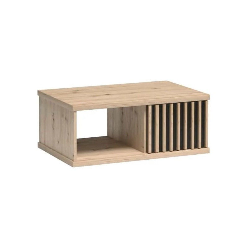 Stolik kawowy CALI C-8 to propozycja dla osób, które cenią połączenie nowoczesnego designu i praktycznych rozwiązań do codziennego użytku. Mebel doskonale sprawdzi się jako ława do salonu, a także jako stolik kawowy na taras podczas komfortowego wypoczynku. Jego największym atutem jest dekoracyjny front szuflady, ozdobiony modnymi lamelami na kontrastującym, czarnym tle, które nadają bryle wyrazisty i designerski charakter. Ciepłe wybarwienie artisan ociepla aranżację i świetnie komponuje się zarówno z nowoczesnymi, jak i bardziej przytulnymi wnętrzami.