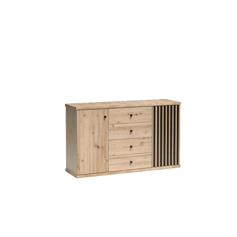 Lamele w formie listew zdecydowanie wyróżniają tę komodę, nadając jej nowoczesny i niepowtarzalny charakter. Ciemne tło oraz eleganckie uchwyty w kolorze dąb artisan tworzą spektakularny efekt, który doskonale wpisuje się w współczesne aranżacje wnętrz.