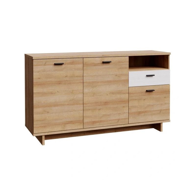 Komoda CHESAPEAKE to stylowe i praktyczne rozwiązanie do każdego nowoczesnego salonu. Dzięki przemyślanej konstrukcji, obejmującej 1 szufladę, 3 zamykane szafki oraz otwartą wnękę, z łatwością zorganizujesz przestrzeń na dokumenty, odzież, akcesoria i wszystko to, co chcesz mieć pod ręką, a jednocześnie poza zasięgiem wzroku. Blat oraz otwarta wnęka idealnie sprawdzą się do eksponowania zdjęć, ceramiki czy dekoracji. Komoda została wykonana w efektownym połączeniu dekorów Dąb Riviera i Dąb Śnieżny, które dodają elegancji i ciepła każdemu wnętrzu. Dodatkową zaletą są nóżki typu ślizgacz, chroniące podłogę przed zarysowaniami oraz możliwość mocowania do ściany, co zwiększa stabilność i bezpieczeństwo użytkowania.