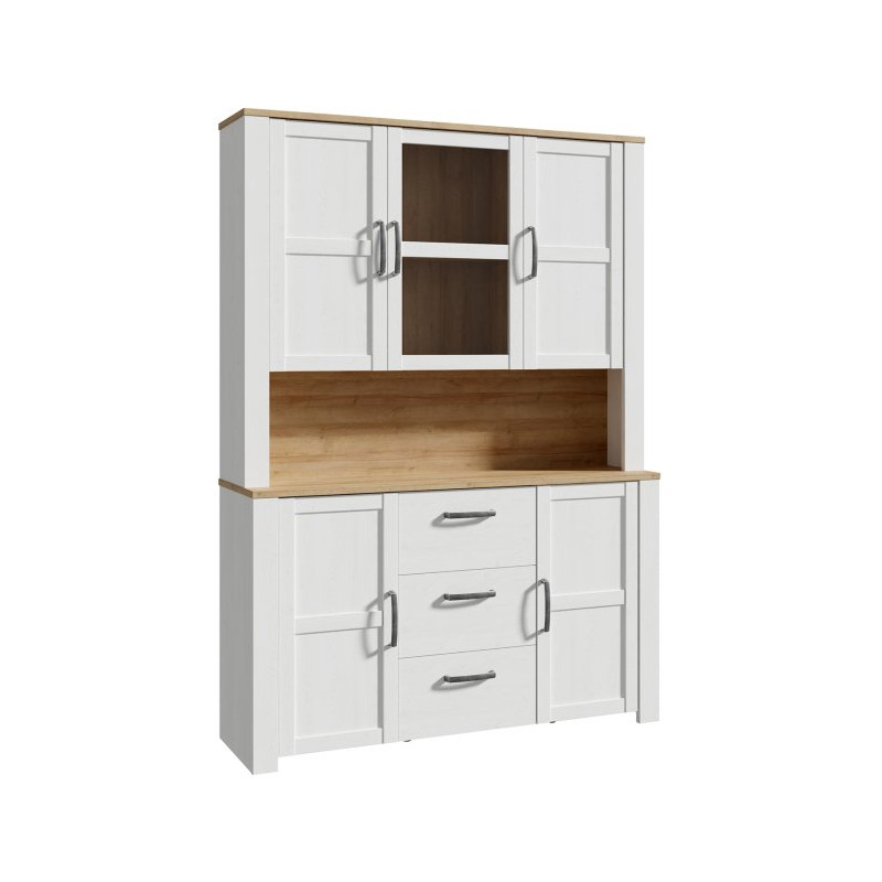 Witryna Chisbury BHLV831 marki Meble Forte o szerokości 150 cm to elegancki i funkcjonalny element wyposażenia, który wniesie do Twojego salonu lub jadalni wyjątkowy styl oraz praktyczność. Połączenie jasnych frontów z ciepłym, naturalnym dekorem blatu i wnętrza tworzy harmonijną całość, doskonale wpisującą się w aranżacje w stylu skandynawskim, rustykalnym czy prowansalskim. Subtelne uchwyty i przeszklone elementy frontów podkreślają ponadczasowy charakter mebla, który z łatwością stanie się ozdobą przestrzeni.