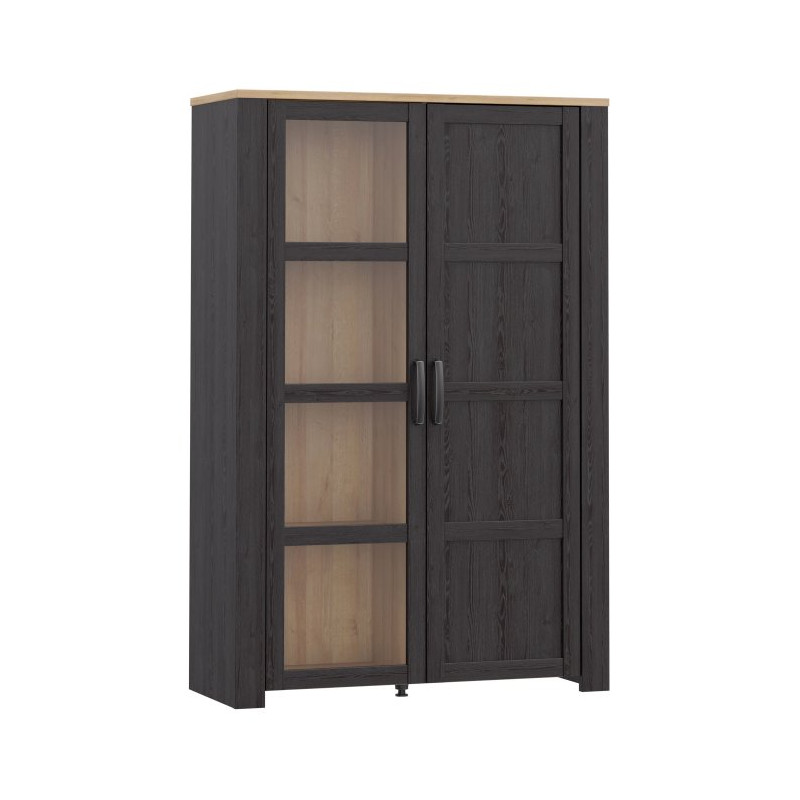 Wysoka witryna Chisbury BHLV621 marki Meble Forte o szerokości 110 cm to elegancki mebel, który doskonale łączy funkcję przechowywania z dekoracyjną formą. Ciemne fronty z przeszkleniami w połączeniu z ciepłym, naturalnym dekorem wnętrza nadają całości lekkości i ponadczasowego charakteru. Smukła bryła sprawia, że witryna świetnie sprawdzi się zarówno w salonie, jak i jadalni, nie przytłaczając przestrzeni.