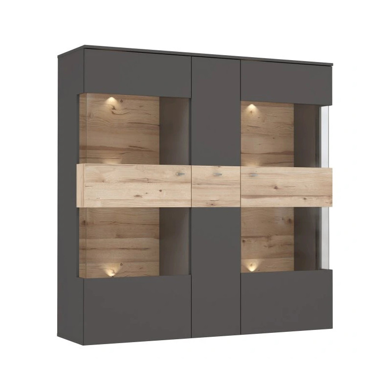 Witryna 150 cm COMO w dekorze Grafit / Deska Dębowa to nowoczesne rozwiązanie dla tych, którzy cenią estetykę, funkcjonalność i możliwość ekspozycji pamiątek. Jej szerokie wymiary i staranne wykończenie sprawiają, że doskonale sprawdzi się zarówno w salonie, jak i pokoju dziennym. Dzięki częściowo przeszklonym frontom wyeksponujesz zdjęcia, ceramikę czy inne cenne pamiątki, zachowując je jednocześnie w czystości.
