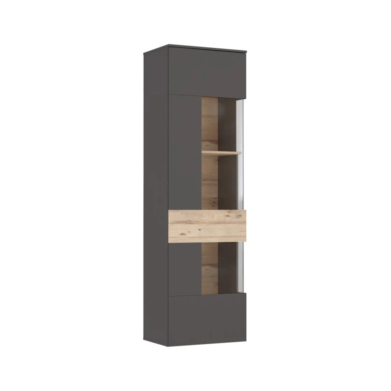 Witryna 60 cm COMO to nowoczesna propozycja dla osób poszukujących eleganckiego, a jednocześnie praktycznego mebla do salonu lub pokoju dziennego. Jej wysoki i wąski format pozwala na aranżację nawet w niewielkiej przestrzeni, a ponadczasowy design sprawia, że doskonale wpisuje się zarówno w klasyczne, jak i nowoczesne wnętrza. Połączenie dekorów Uni Wolfram Szary i Deska Dębowa tworzy harmonijny, stylowy duet.
