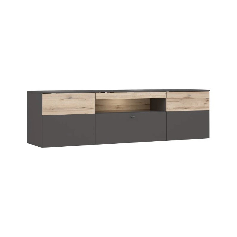 Centralna wnęka na sprzęt RTV została wyposażona w nastrojowe oświetlenie LED, które tworzy wyjątkowy klimat i eksponuje elektroniczne urządzenia. Poniżej znajduje się szuflada na prowadnicach Quadro, zapewniająca płynne i ciche wysuwanie. Dodatkowo mebel oferuje trzy zamknięte półki idealne do przechowywania kabli, dokumentów czy akcesoriów. Duży blat o długości 210 cm z powodzeniem pomieści telewizor i dekoracje.