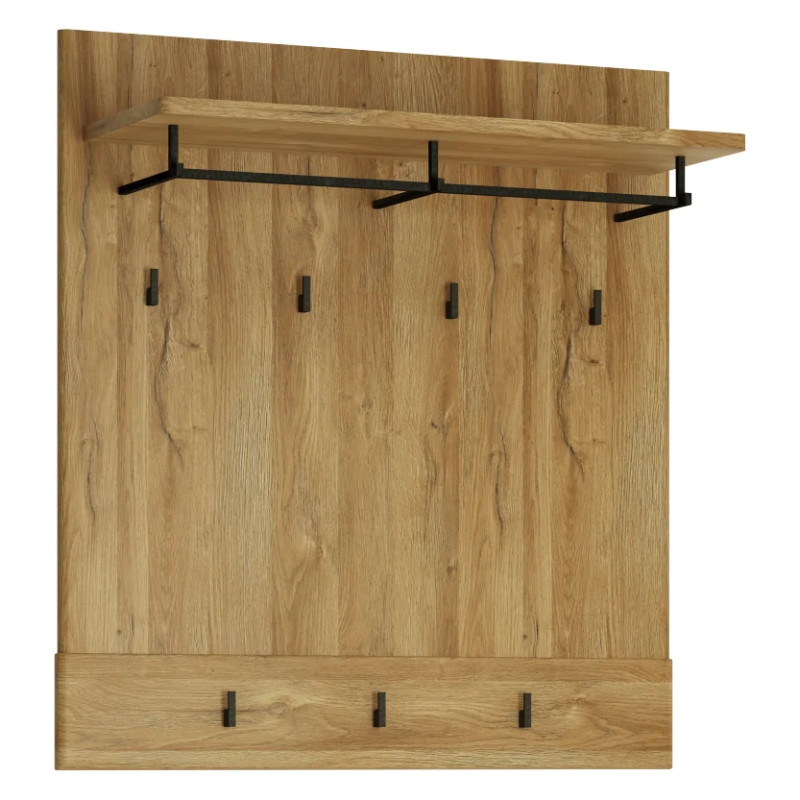 Panel został wyposażony w siedem praktycznych haczyków, drążek na wieszaki oraz półkę na drobne akcesoria, takie jak czapki, rękawiczki czy szaliki. Dzięki temu wszystkie niezbędne elementy garderoby mogą być zawsze pod ręką. Dodatkowym atutem mebla jest panel tylny, który chroni ścianę przed zabrudzeniami i wilgocią, a jednocześnie stanowi elegancki element dekoracyjny.