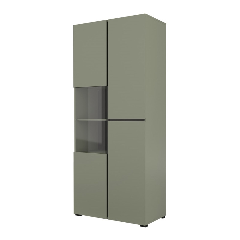 Witryna Cross 3D typ 12 w kolorze zgaszonej zieleni od Helvetia Wieruszów to stylowe połączenie funkcjonalności i nowoczesnej estetyki. Głęboka, stonowana zieleń wprowadza do wnętrza nutę elegancji i natury, a w zestawieniu z czarnymi wstawkami tworzy efektowny kontrast. Geometryczna forma i dopracowane detale sprawiają, że mebel ten znakomicie prezentuje się w nowoczesnych salonach, jadalniach czy pokojach dziennych. Witryna została wyposażona w 10 półek ukrytych za 3 drzwiami, z czego jedna część jest przeszklona – idealna do ekspozycji dekoracji, szkła lub pamiątek. Dodatkową zaletą jest możliwość zamontowania opcjonalnego oświetlenia LED, które podkreśli zawartość i stworzy przytulny klimat.