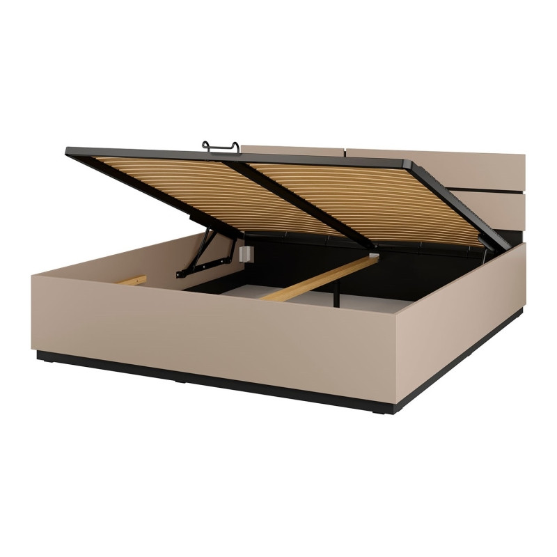 Mebel wyposażono w funkcjonalny pojemnik na pościel, co pozwala efektywnie wykorzystać przestrzeń i zachować porządek. Wygodny dostęp do schowka zapewnia podnośnik stelaża, ułatwiający codzienne użytkowanie. Dodatkowym atutem jest możliwość wyboru strony dekoracyjnego zdobienia na zagłówku podczas montażu, co zwiększa elastyczność aranżacyjną.