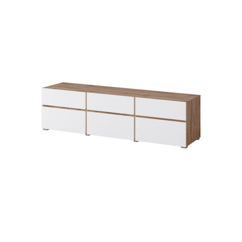 Szafka RTV Cross 3K3S typ 41 w wersji z białym frontem i korpusem dąb wotan od Helvetia Wieruszów to połączenie nowoczesnej elegancji z naturalnym wykończeniem. Jasne fronty w kolorze białym nadają meblowi lekkości i świeżości, podczas gdy korpus w dekorze dąb wotan wprowadza ciepły, przytulny akcent inspirowany naturą. Niskie nóżki – dopełniają całości, tworząc stylowy i spójny wizualnie efekt. Przemyślany układ z 3 szufladami i 3 uchylnymi schowkami zapewnia wygodne miejsce na akcesoria multimedialne, dokumenty i inne przedmioty codziennego użytku. To idealny wybór do wnętrz, które łączą nowoczesny styl z funkcjonalnością i przyjazną estetyką.
