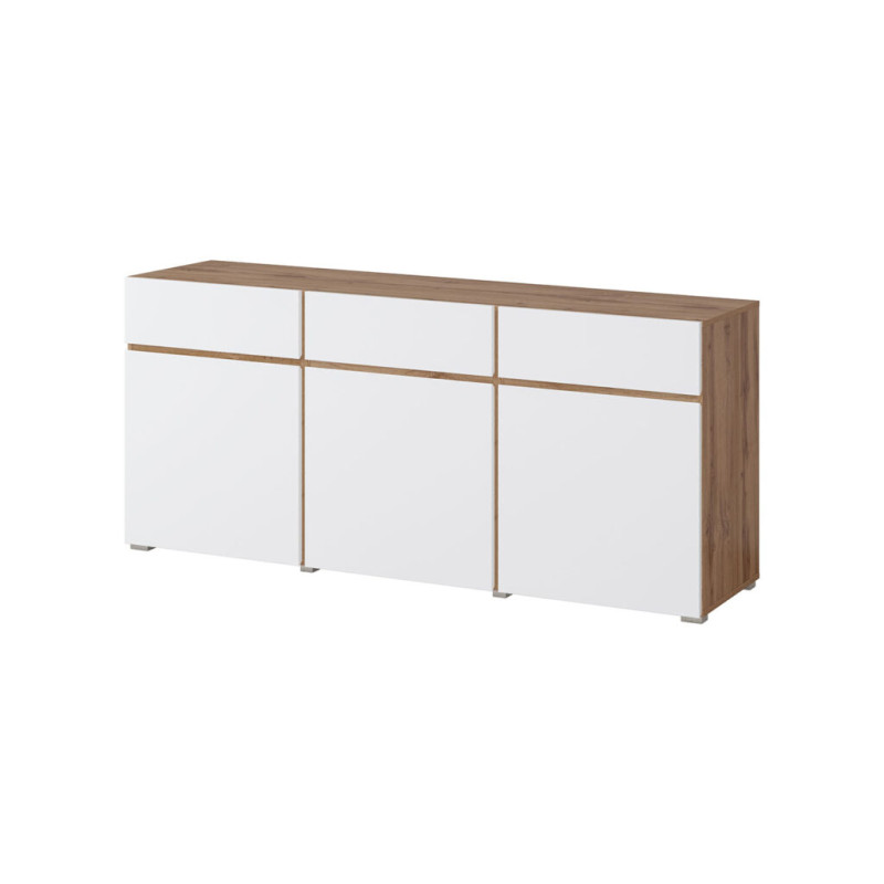 Układ z trzema pojemnymi szufladami i trzema zamykanymi frontami kryjącymi sześć półek zapewnia funkcjonalność i dużą ilość miejsca do przechowywania. To idealny wybór do salonu, jadalni czy domowego biura, gdzie liczy się porządek i estetyka.