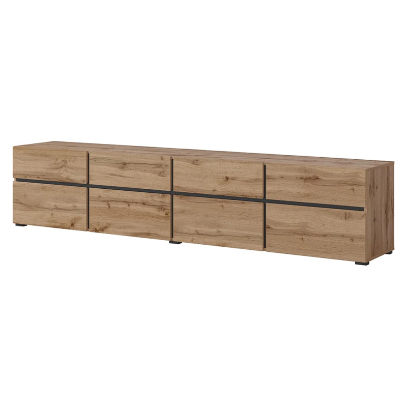 Dzięki wymiarom 225 × 48 × 40 cm szafka RTV pełni funkcję reprezentacyjną, jednocześnie oferując praktyczną przestrzeń do przechowywania.