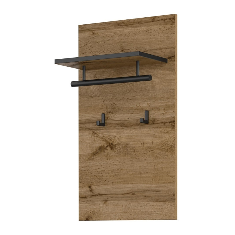 Panel wiszący Cross typ 03 w kolorze dąb wotan od Helvetia Wieruszów to nowoczesne i funkcjonalne rozwiązanie dla osób, które cenią praktyczne, ale estetyczne wyposażenie przedpokoju. Ciepły, naturalny dekor dąb wotan w połączeniu z czarnymi elementami tworzy elegancki kontrast, podkreślając stylowy charakter wnętrza. Panel doskonale sprawdzi się w mniejszych i średnich korytarzach, gdzie liczy się każdy centymetr przestrzeni. Wyposażony w półkę, drążek oraz dwa metalowe wieszaki, umożliwia wygodne przechowywanie odzieży wierzchniej oraz codziennych akcesoriów. To idealny wybór dla tych, którzy szukają połączenia funkcji z estetyką w jednym kompaktowym meblu.