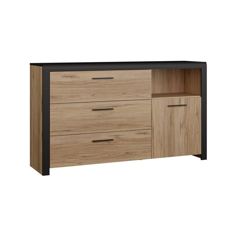 Komoda z 3 szufladami Dalate DQLK22 to stylowy mebel o nowoczesnym charakterze. Naturalny dekor drewna w połączeniu z czarnymi elementami tworzy elegancki kontrast, który świetnie pasuje do współczesnych aranżacji salonu, sypialni czy przedpokoju.