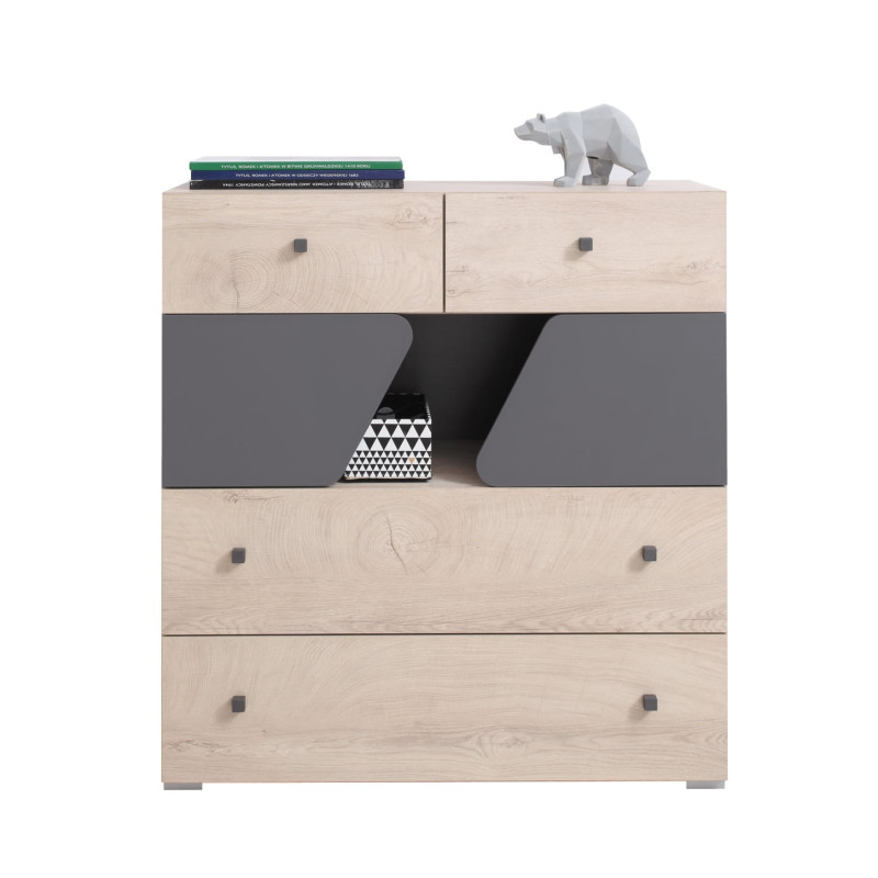 Komoda z szufladami Delta to solidna baza porządku w młodzieżowym pokoju. Połączenie dekoru dębowego z antracytowym akcentem prezentuje się świeżo i uniwersalnie, pozwalając łatwo zmieniać charakter wnętrza dodatkami. Pojemne szuflady pomagają posegregować ubrania, akcesoria i drobiazgi, a część zamknięta utrzymuje wizualny ład na co dzień. Fronty o prostych liniach współgrają z nowoczesną stylistyką, tworząc spójny duet z innymi elementami kolekcji. Laminowana powierzchnia jest odporna na codzienne użytkowanie i szybka w pielęgnacji, co docenisz w dynamicznym domowym rytmie. Mebel dobrze odnajdzie się zarówno w strefie wypoczynku, jak i w narożniku z biurkiem, stając się estetycznym organizerem przestrzeni. To funkcjonalna odpowiedź na potrzeby dorastającego użytkownika – przejrzysta, praktyczna i przygotowana na zmianę aranżacji wraz z rozwojem pasji.