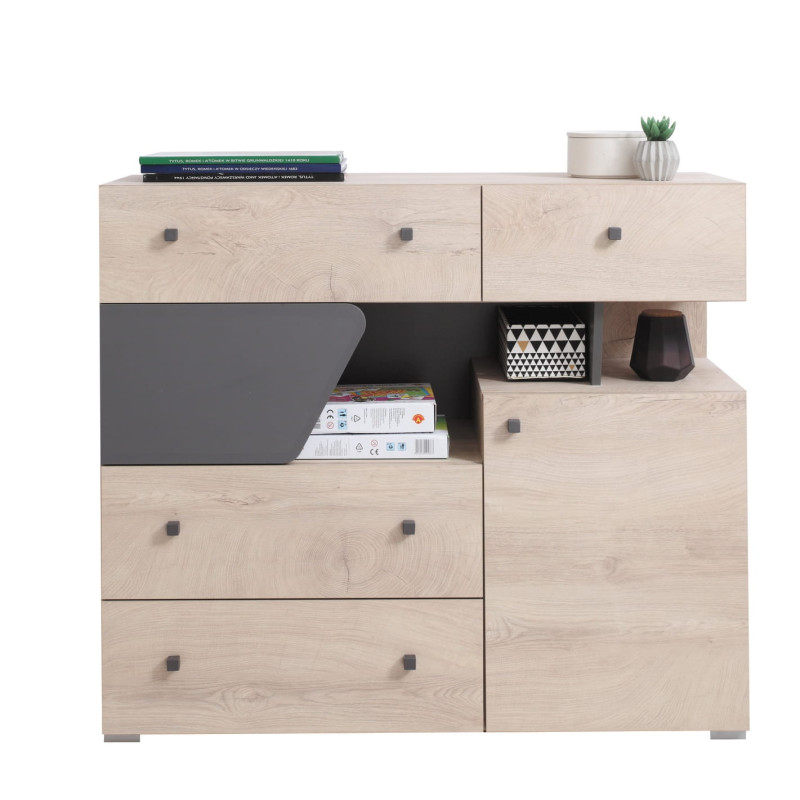 Komoda Delta łączy minimalizm formy z praktycznym układem przechowywania, który sprawdzi się w pokoju młodzieżowym i dziecięcym. Naturalny rysunek dębu ociepla przestrzeń, a antracyt dodaje jej nowoczesnej energii. Zrównoważone proporcje i proste linie pomagają utrzymać porządek, a jednocześnie nie przytłaczają aranżacji. To mebel, który rośnie wraz z użytkownikiem – od pierwszych zabawek po szkolne akcesoria i modowe drobiazgi. Laminowana powierzchnia jest odporna na codzienne wyzwania, a stonowana paleta kolorów pozwala swobodnie eksperymentować z dodatkami. Komoda pięknie komponuje się z półkami, biurkiem czy szafą z tej kolekcji, tworząc spójny zestaw. Jej uniwersalny charakter sprawia, że równie dobrze odnajdzie się w kąciku sypialnianym, jak i w strefie nauki. To stylowe, przemyślane rozwiązanie, które zapewnia funkcjonalność bez rezygnowania z estetyki.