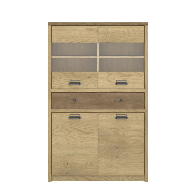 Witryna czterodrzwiowa z szufladą DENZEL to rozbudowany mebel do salonu lub jadalni, który łączy przestrzeń ekspozycyjną z wygodnym przechowywaniem. Przeszklone strefy pozwalają wyeksponować dekoracje, szkło lub ulubione dodatki, a część pełna i dolna szuflada pomagają zachować porządek na co dzień.