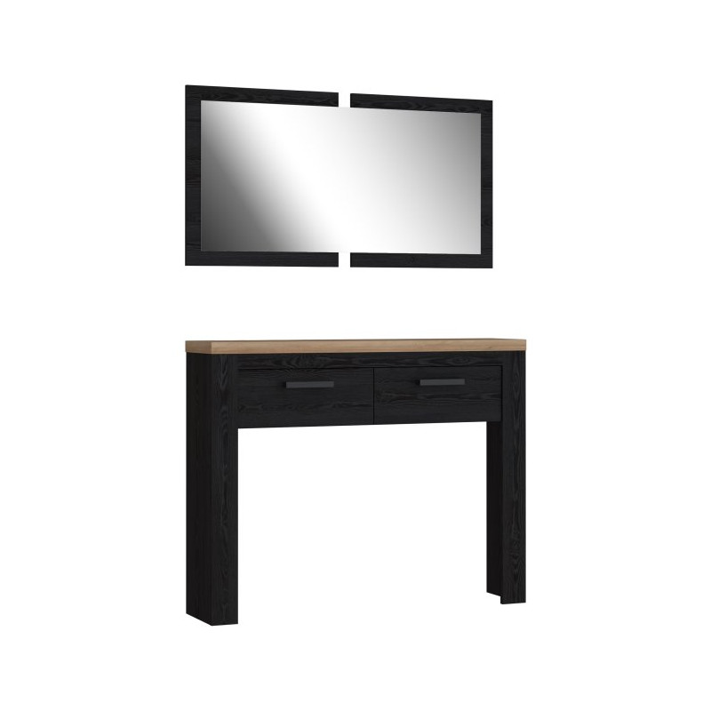 Dwie pojemne szuflady na prowadnicach kulkowych pomieszczą klucze, dokumenty czy akcesoria, a blat o szerokości ponad 100 cm posłuży jako miejsce do wyeksponowania dekoracji lub odłożenia torebki. Drewniane nóżki z ślizgaczami chroniącymi podłogę oraz czarne, metalowe uchwyty podkreślają nowoczesny charakter mebla, który świetnie wpisuje się w różne style wnętrz.