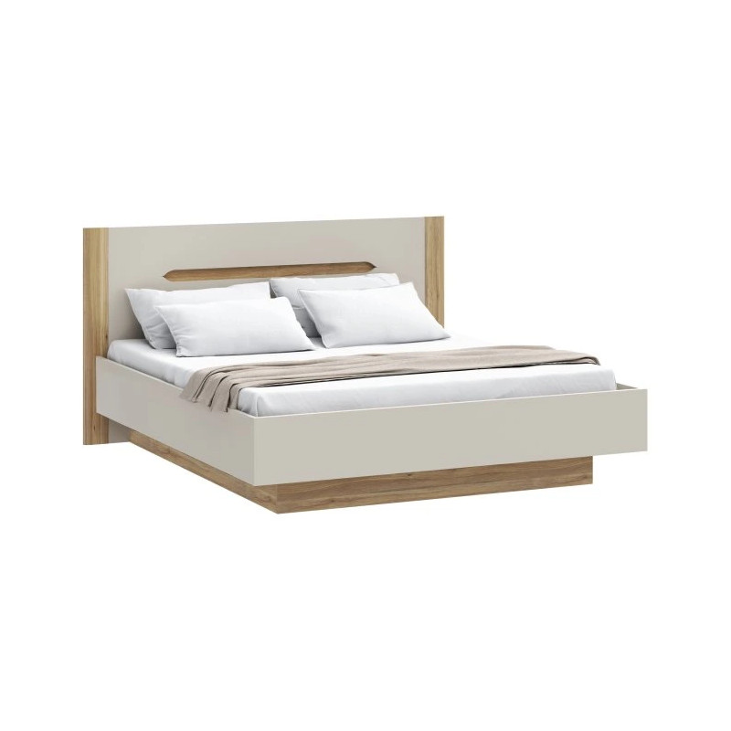Neutralny beżowy korpus został efektownie przełamany elementami w dekorze Dąb Mauvella, które pojawiają się na podstawie oraz wezgłowiu, nadając całości elegancki i ponadczasowy charakter. Stabilna konstrukcja łóżka wykonana z płyty wiórowej została dodatkowo wzmocniona obrzeżami ABS, co przekłada się na większą trwałość i odporność na codzienne użytkowanie.