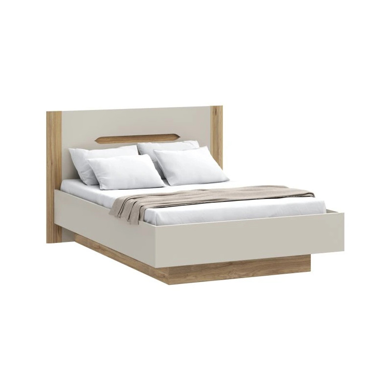 Beżowy korpus łóżka przełamany został listwami w dekorze Dąb Mauvella, które podkreślają jego elegancki, a zarazem uniwersalny charakter. Dzięki neutralnej kolorystyce mebel świetnie komponuje się zarówno z jasną, jak i bardziej wyrazistą pościelą. Solidna konstrukcja z płyty wiórowej oraz wzmocnienia obrzeżami ABS zapewniają trwałość i bezpieczeństwo użytkowania przez lata.