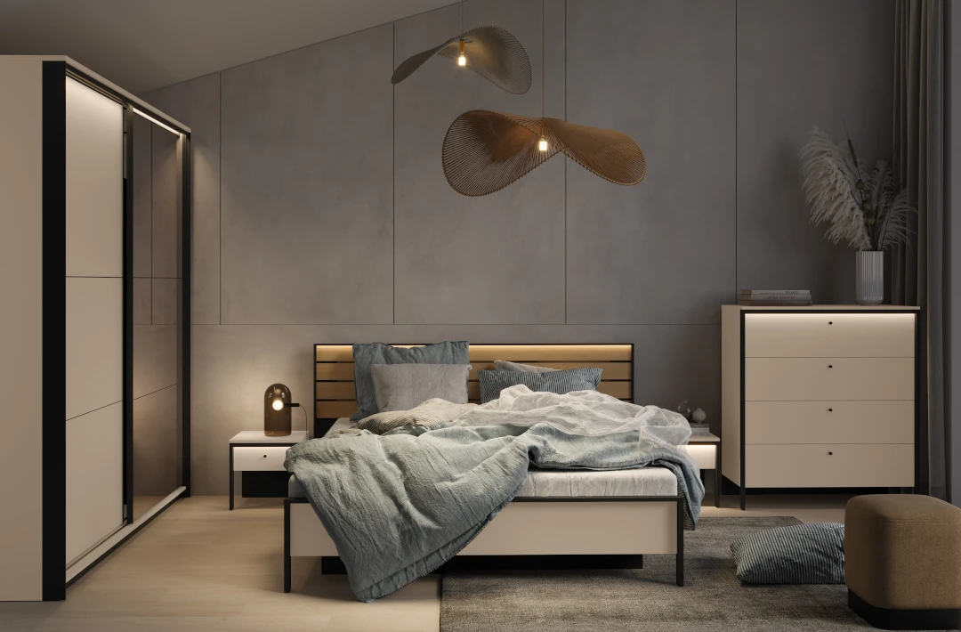 Wykonana z płyty wiórowej laminowanej o grubości 16 mm, z frontami w kolorze beżu piaskowego i czarnymi akcentami, prezentuje się elegancko i stylowo.