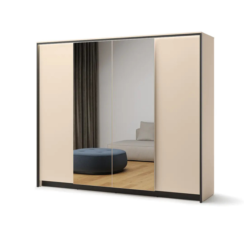 Szafa Enna to elegancki i funkcjonalny mebel, który doskonale sprawdzi się w nowoczesnych wnętrzach. Jej wymiary wynoszą 251 cm szerokości, 221 cm wysokości i 63 cm głębokości, co zapewnia obszerną przestrzeń do przechowywania. Wykonana z wysokiej jakości materiałów, łączy beż piaskowy z czarnymi akcentami, nadając jej nowoczesny i elegancki wygląd.
