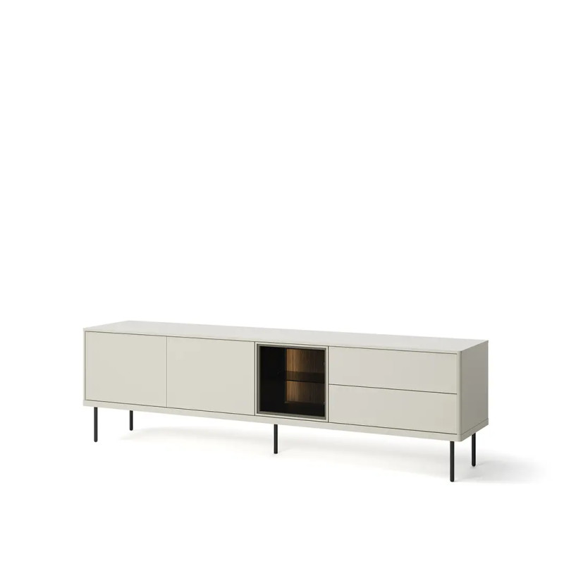 Szafka RTV EP-07 z kolekcji EPIRO to stylowy i praktyczny mebel, który doskonale dopełni aranżację nowoczesnego salonu. Jej elegancka kolorystyka, łącząca ciepły odcień kaszmiru z ciemnymi, matowymi wstawkami, wprowadza do wnętrza przytulność i wyrafinowany charakter. Fronty o subtelnym wykończeniu i minimalistyczne uchwyty podkreślają nowoczesny styl, a precyzyjne wykonanie gwarantuje trwałość i wysoką jakość mebla.