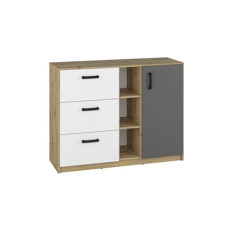 Nowoczesna i zdecydowana kombinacja kolorów - białego alpejskiego i antracytowego z klasycznym usłojeniem dębu artisan odzwierciedla dynamiczny temperament nastolatków. Geometria frontów i korpusów tworzy efekt porządku, spójności oraz młodzieżowej elegancji.