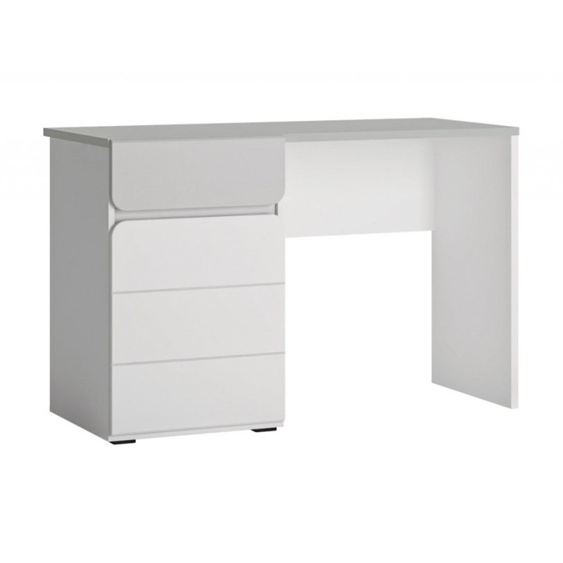 Biurko zostało wyposażone w nowoczesny system bezuchwytowy, który dodatkowo podkreśla jego estetykę i zapewnia wygodę użytkowania. Dzięki temu mebelowi można otwierać szufladę i szafkę jednym płynnym ruchem, bez potrzeby uchwytów, co sprawia, że jest ono nie tylko funkcjonalne, ale również bardzo stylowe.