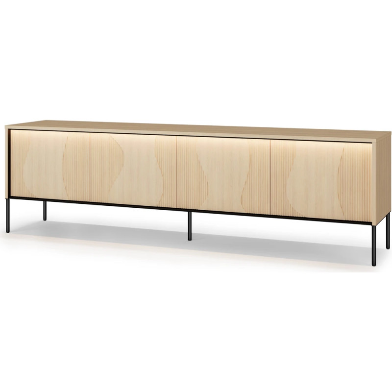 Dzięki czterem zamykanym frontom użytkownik zyskuje dostęp do pojemnej przestrzeni wewnętrznej, idealnej na sprzęt RTV, dokumenty czy drobne akcesoria. Wnętrze z wbudowaną półką sprzyja organizacji i porządkowi. Dodatkowo zintegrowane oświetlenie nie tylko podnosi komfort użytkowania, ale także subtelnie eksponuje linię mebla, tworząc przyjemny klimat w pomieszczeniu.