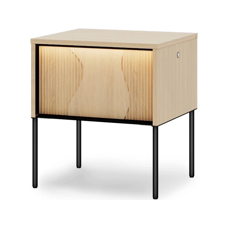 Szafka nocna Flow z oświetleniem to stylowe i funkcjonalne uzupełnienie strefy snu. Dzięki zintegrowanemu oświetleniu LED mebel zapewnia komfort użytkowania po zmroku bez potrzeby zapalania głównego światła — to praktyczne i przyjazne rozwiązanie, szczególnie w sypialni. Lekka forma na smukłych nóżkach dodaje aranżacji subtelności i nowoczesnego charakteru.