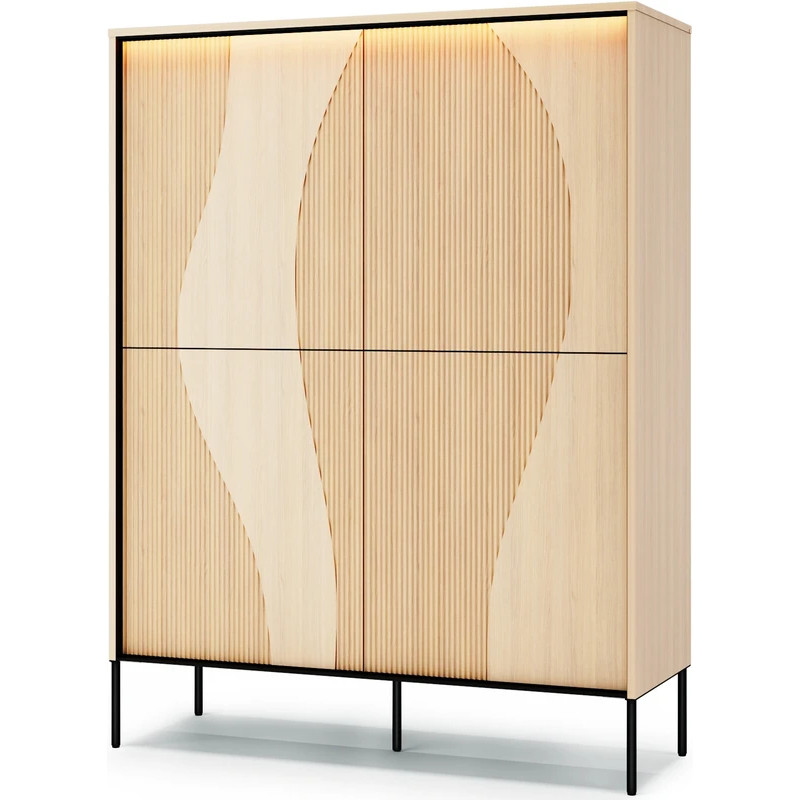Rozbudowany układ półek za czterema drzwiami zapewnia wygodną segregację i szybki dostęp do przechowywanych przedmiotów. Mebel świetnie sprawdzi się w salonie, jadalni czy domowym gabinecie — idealny do przechowywania tekstyliów, dokumentów, akcesoriów multimedialnych czy zastawy. Zintegrowane oświetlenie ułatwia korzystanie z komody po zmroku i estetycznie podkreśla linię frontów.