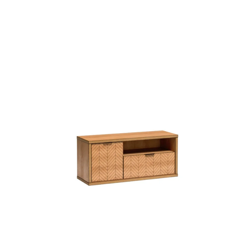 Szafka RTV z kolekcji Fonti to niezwykle eleganckie i funkcjonalne rozwiązanie, które doskonale uzupełni aranżację każdego salonu. Kolor dąb karmel oraz charakterystyczny wzór w jodełkę na frontach nadają witrynie wyjątkowego uroku i klasy.