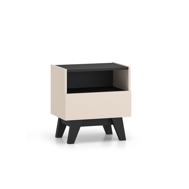 Szafka nocna Freshion 06 od producenta ML Meble to elegancki i funkcjonalny mebel, idealny do nowoczesnych sypialni. Jej minimalistyczny design łączy kolor kaszmirowy z czarnymi akcentami oraz wysokimi, czarnymi nóżkami, tworząc harmonijną i stylową kompozycję.