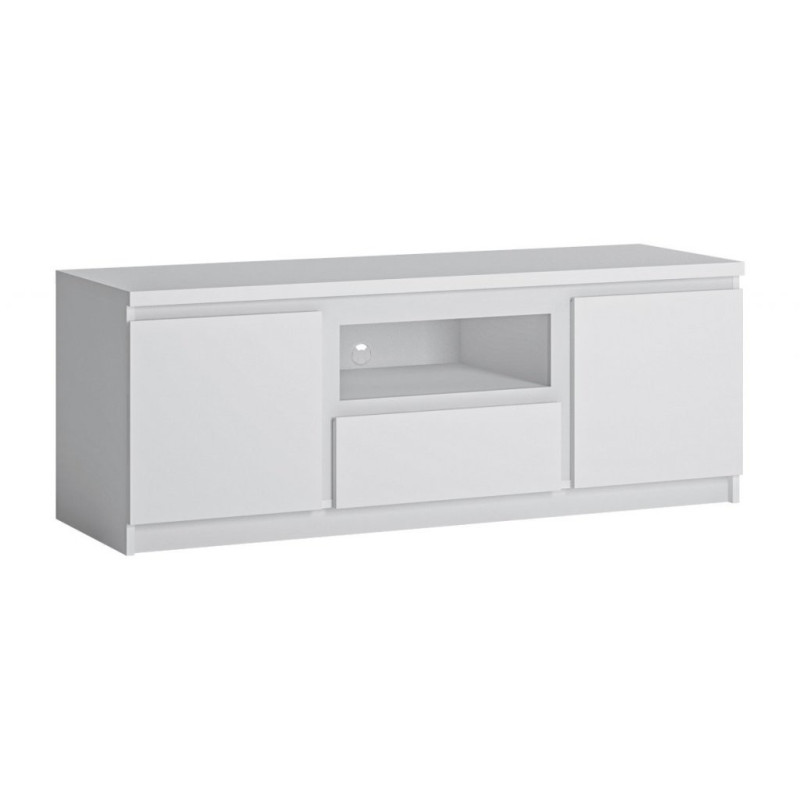 Szafka Fribo została wyposażona w otwartą wnękę, a także puste przestrzenie znajdujące się za zamkniętymi drzwiami. Taki układ pozwoli Ci przechować mniejszy sprzęt RTV – typu konsolę, a także filmy, płyty oraz inne akcesoria. Ciekawym rozwiązaniem jest system cichego domyku, który zapewnia bezdźwięczne korzystanie z szafki RTV Fribo. Mebel dostępny w dwóch szerokościach – 135,4 oraz 165,4 cm.