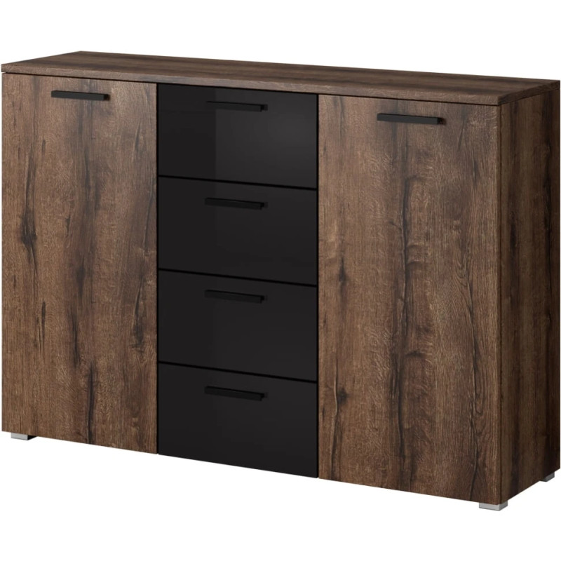 Komoda Galaxy to funkcjonalny mebel do przechowywania, który łączy praktyczny układ wnętrza z prostą, nowoczesną formą. Konstrukcja składająca się z dwóch zamykanych szafek bocznych oraz centralnej sekcji z szufladami pozwala wygodnie uporządkować różne przedmioty – od większych elementów wyposażenia po drobne akcesoria codziennego użytku.