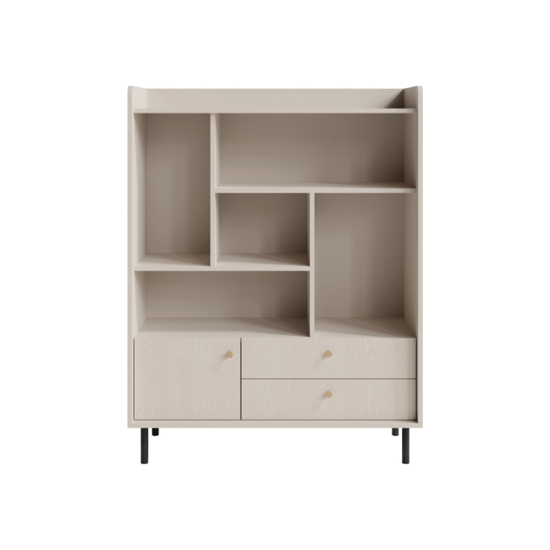 Regał GR3 z kolekcji Grande od producenta Meblar to elegancki i funkcjonalny mebel, który doskonale wpasuje się w nowoczesne wnętrza. Wykonany z wysokiej jakości laminowanej płyty o grubości 16 mm, zapewnia trwałość i odporność na uszkodzenia. Jego powierzchnia wykończona jest w piaskowym odcieniu beżu, łącząc gładkie elementy z subtelną strukturą drewna na frontach, co nadaje mu unikalny charakter. Dodatkowo, regał wyposażony jest w solidne, czarne, metalowe nóżki oraz minimalistyczne uchwyty w złotym kolorze, które podkreślają jego nowoczesny styl.