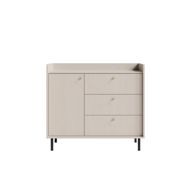 Komoda GR6 z kolekcji Grande od producenta Meblar to elegancki i funkcjonalny mebel, idealny do nowoczesnych wnętrz. Wykonana z wysokiej jakości laminowanej płyty o grubości 16 mm, zapewnia trwałość i odporność na uszkodzenia. Jej powierzchnia wykończona jest w piaskowym odcieniu beżu, łącząc gładkie elementy z subtelną strukturą drewna na frontach, co nadaje jej unikalny charakter. Dodatkowo, komoda wyposażona jest w solidne, czarne, metalowe nóżki oraz minimalistyczne uchwyty w złotym kolorze, które podkreślają jej nowoczesny styl.