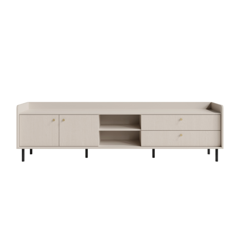 Szafka RTV GR7 z kolekcji Grande od producenta Meblar to elegancki i funkcjonalny mebel, idealny do nowoczesnych wnętrz. Wykonana z wysokiej jakości laminowanej płyty o grubości 16 mm, zapewnia trwałość i odporność na uszkodzenia. Jej powierzchnia wykończona jest w piaskowym odcieniu beżu, łącząc gładkie elementy z subtelną strukturą drewna na frontach, co nadaje jej unikalny charakter. Dodatkowo, szafka wyposażona jest w solidne, czarne, metalowe nóżki oraz minimalistyczne uchwyty w złotym kolorze, które podkreślają jej nowoczesny styl.