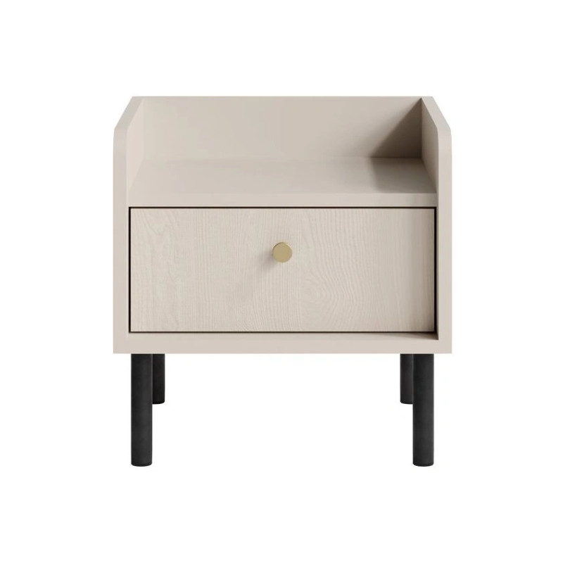 Szafka nocna GR15 Grande to niewielki, ale niezwykle funkcjonalny mebel w stylu skandynawskim, który doskonale uzupełni wystrój sypialni. Jej prosta, elegancka forma oraz stonowana kolorystyka beżu piaskowego wprowadza do wnętrza spokój i harmonię. Wyposażona w praktyczną szufladę, idealnie sprawdzi się do przechowywania drobiazgów, książki czy ładowarki. Złoty uchwyt i czarne nogi nadają jej nowoczesnego charakteru i lekkości. To idealny wybór dla osób ceniących estetykę, porządek i funkcjonalność w małym formacie.