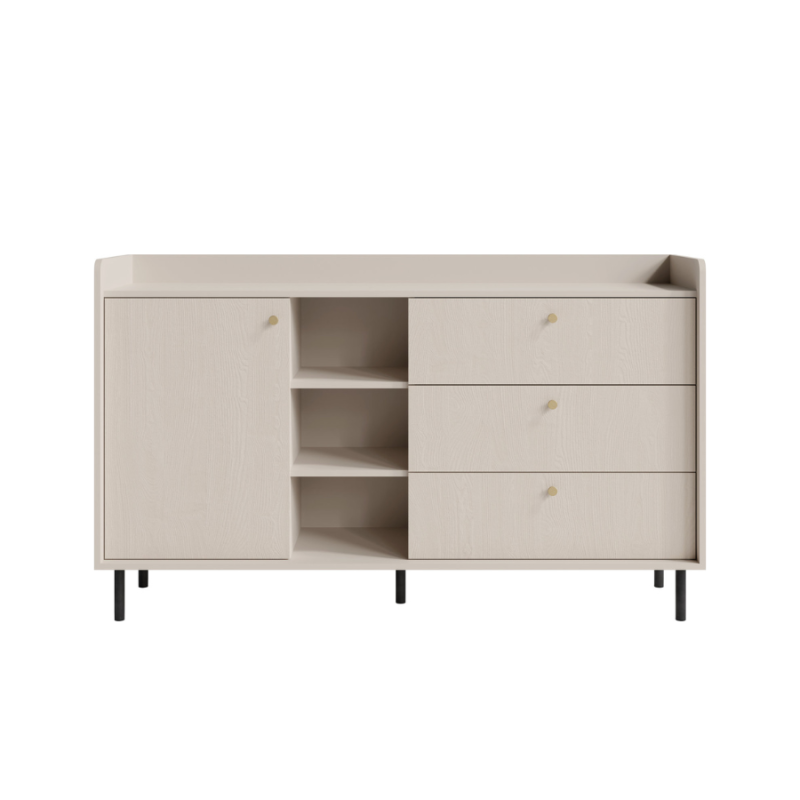 Komoda GR5 z kolekcji Grande od producenta Meblar to elegancki i funkcjonalny mebel, który doskonale wpasuje się w nowoczesne wnętrza. Wykonana z wysokiej jakości laminowanej płyty o grubości 16 mm, zapewnia trwałość i odporność na uszkodzenia. Jej powierzchnia wykończona jest w piaskowym odcieniu beżu, łącząc gładkie elementy z subtelną strukturą drewna na frontach, co nadaje jej unikalny charakter. Dodatkowo, komoda wyposażona jest w solidne, czarne, metalowe nóżki oraz minimalistyczne uchwyty w złotym kolorze, które podkreślają jej nowoczesny styl.