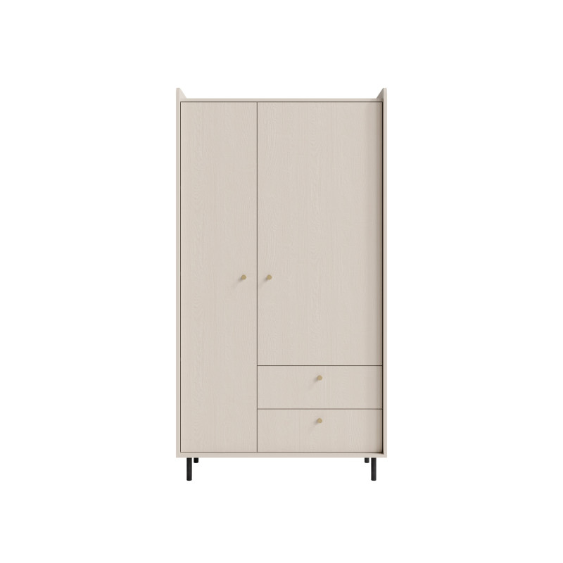 Szafa z szufladami GR12 Grande to elegancki i praktyczny mebel inspirowany skandynawskim stylem, idealny do nowoczesnych wnętrz salonu, sypialni czy pokoju gościnnego. Jej prosta forma i subtelne wykończenie w odcieniu beżu piaskowego tworzą harmonijną i przytulną aranżację. Model GR12 oferuje przemyślaną przestrzeń do przechowywania – wyposażony jest w drążek na wieszaki, pojemne półki oraz dwie szuflady, co ułatwia utrzymanie porządku i organizację garderoby. Szafa została zaprojektowana z dbałością o detale – złote metalowe uchwyty i czarne nóżki dodają jej nowoczesnego charakteru, a jednocześnie podkreślają lekkość konstrukcji.