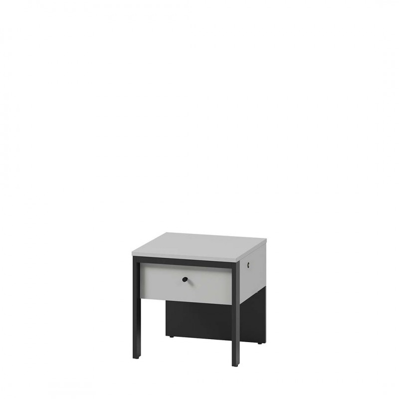 Stolik nocny z szufladą stanowi doskonałe dopełnienie kolekcji GRIS, stworzonej z myślą o aranżacji wnętrz sypialnianych. Konstrukcja tego mebla opiera się na dwóch wysokich przednich nogach, podkreślając styl, oraz płycie z tyłu, która zwiększa stabilność stolika.