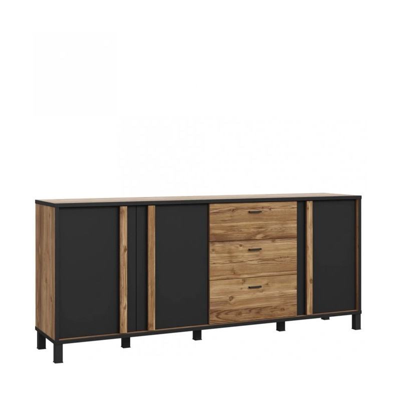 Duża komoda HAYATO Czarny/Świerk Alpejski to funkcjonalny mebel, który doskonale sprawdzi się w nowoczesnych wnętrzach – od salonu, przez jadalnię, aż po sypialnię. Została zaprojektowana z myślą o maksymalnym komforcie użytkowania i dużej ilości miejsca do przechowywania. Trzy pojemne szuflady oraz trzy zamykane szafki z półkami pozwalają na łatwą organizację różnego rodzaju przedmiotów. Połączenie czerni z dekorem Świerk Alpejski dodaje komodzie elegancji i doskonale komponuje się z nowoczesnymi oraz loftowymi aranżacjami.