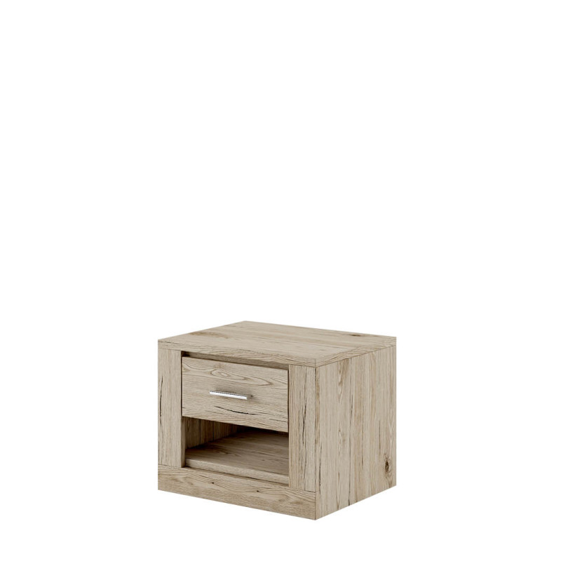 Wykonany z płyty wiórowej laminowanej w kolorze San Remo, stolik nocny łączy naturalny wygląd drewna z trwałością i odpornością na uszkodzenia. Krawędzie blatu i korpusu wykończono obrzeżem ABS, co dodatkowo zwiększa trwałość mebla.