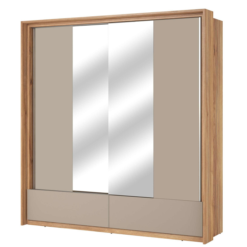 Szafa przesuwna z lustrem 200 Impressio to pojemny mebel do sypialni lub garderoby, zaprojektowany z myślą o wygodnej organizacji większej ilości ubrań i akcesoriów. Dzięki szerokiej bryle oraz drzwiom przesuwnym model dobrze sprawdza się w nowoczesnych wnętrzach, w których ważna jest funkcjonalność i oszczędność miejsca przed meblem. Centralnie umieszczone lustro podnosi komfort codziennego użytkowania i wzmacnia praktyczny charakter szafy.